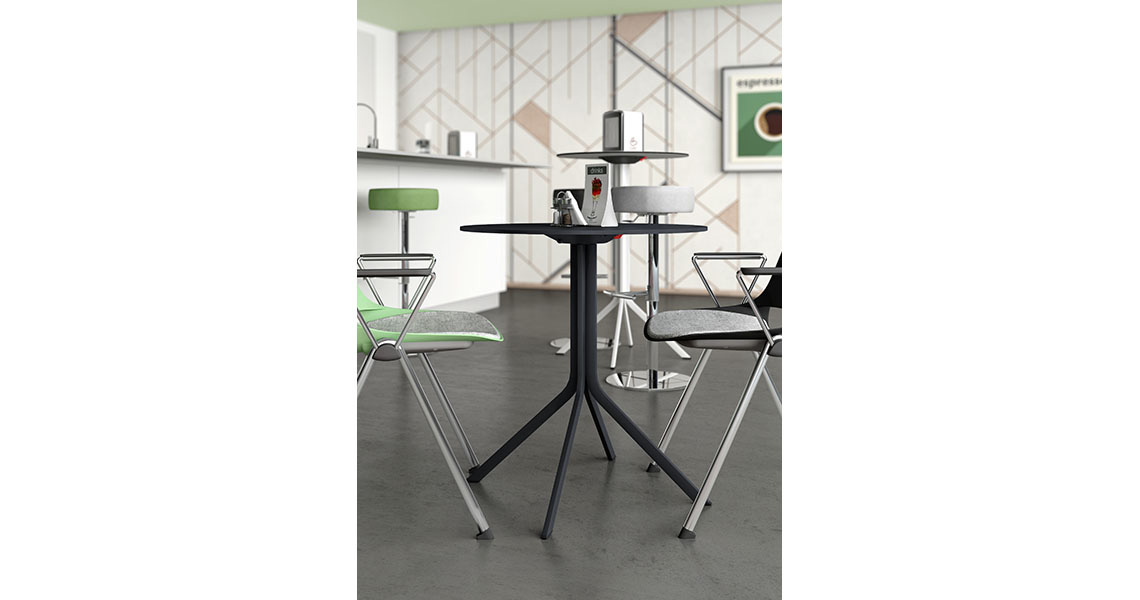 - Mesas altas de tres patas en tubo de acero con un diseño único que se adapta a bares, restaurantes, pizzerías y vinotecas